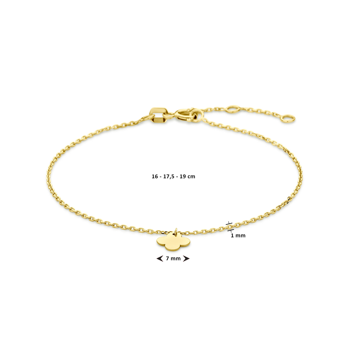 14k Geelgouden armband uitgevoerd met een klavertje. De armband heeft draaglengtes van 16-17.5-19cm.