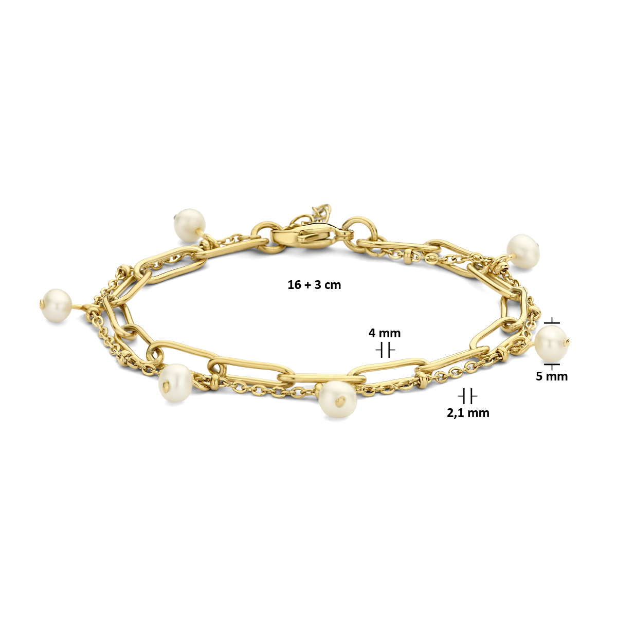 Stalen armband met een goudkleurige ion plating uitgevoerd met zoetwaterparels en een karabijn sluiting. De armband heeft een draaglengte van 16cm met een extensie van 3cm. Geen garantie op de plating.