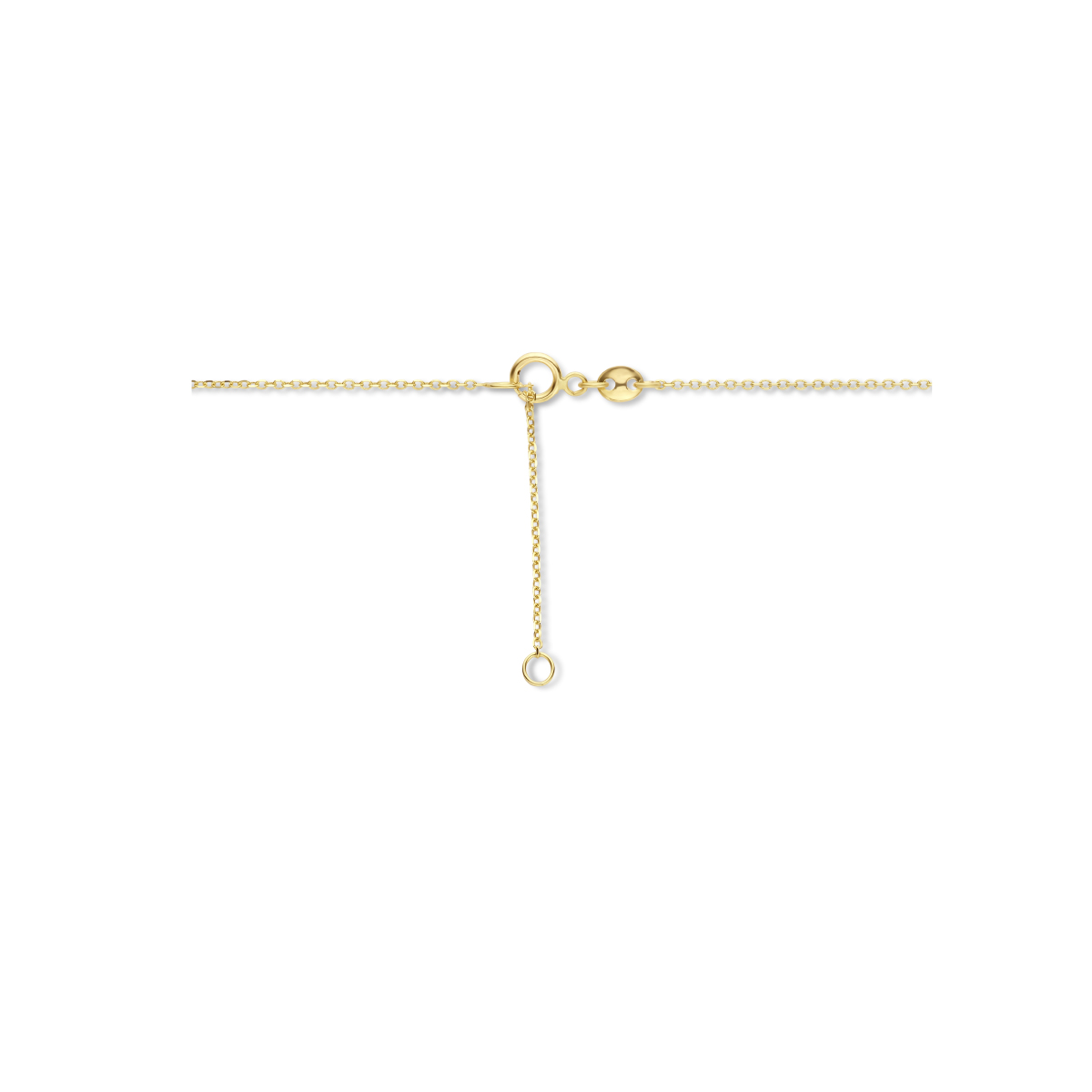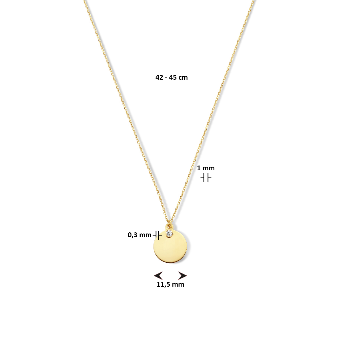 14k Geelgouden collier uitgevoerd met een ronde hanger van 11.5mm en een hangertje met schitterende zirkonia. De schakelbreedte is 1mm. De dikte van de plaat is 0.3mm.