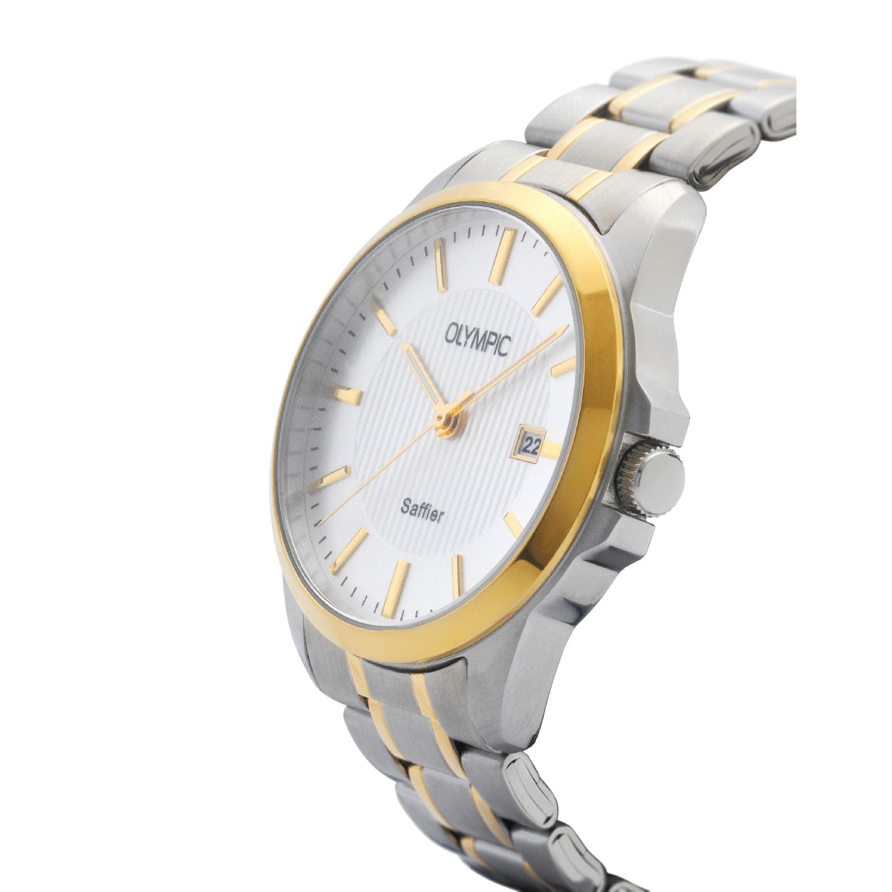 Een klassiek herenhorloge met saffierglas! De OL26HSS288B uit de Bari serie van Olympic heeft een bewerkte zilverkleurige wijzerplaat, een bicolor stalen band en een subtiele kastdiameter van 39mm. Het saffierglas is krasvast en zeer helder, waardoor het langer mooi blijft dan mineraalglas. Een horloge dat uitstekend te combineren is met een casual outfit, maar ook zeker geschikt is voor een business look!